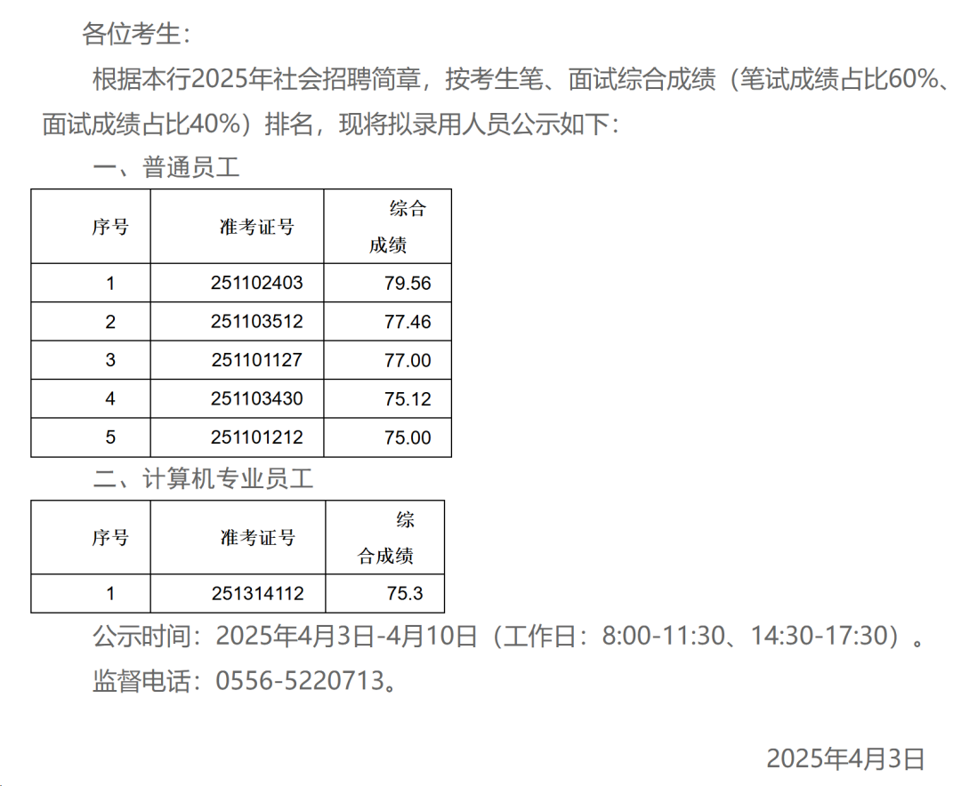 安徽农商行社会招聘网www.ahnshzp.com将2025年安庆农商行社会招聘拟录用人员公示发布如下: