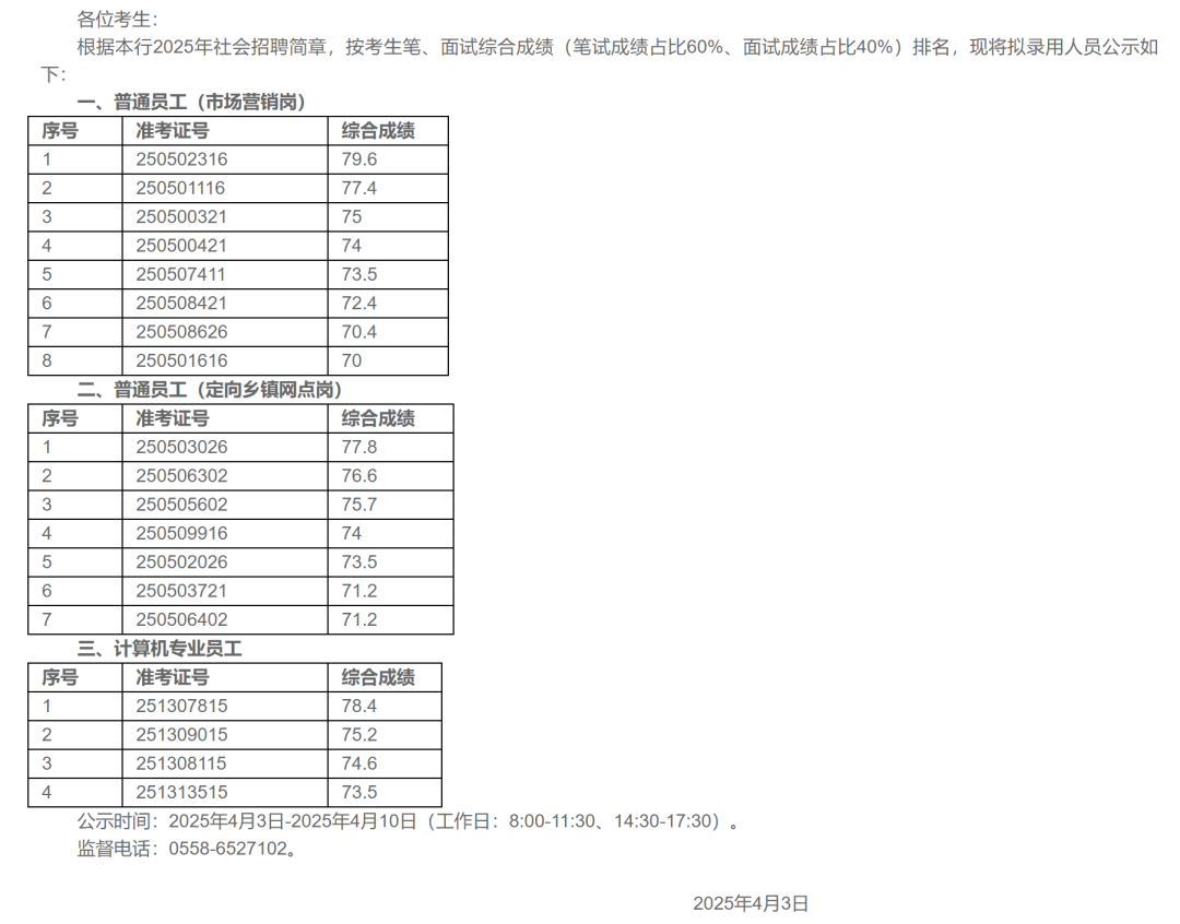 2025年临泉农商行社会招聘拟录用人员公示